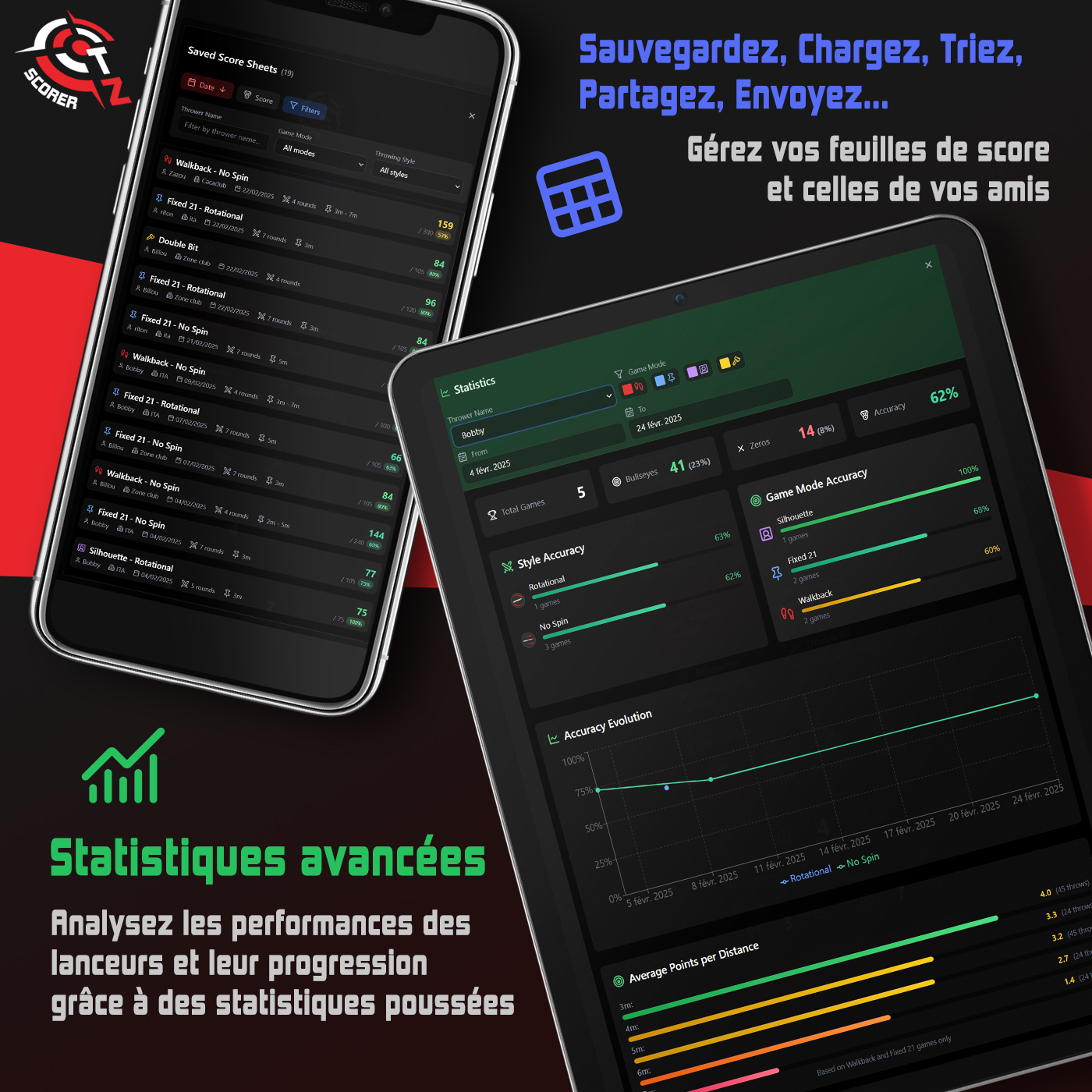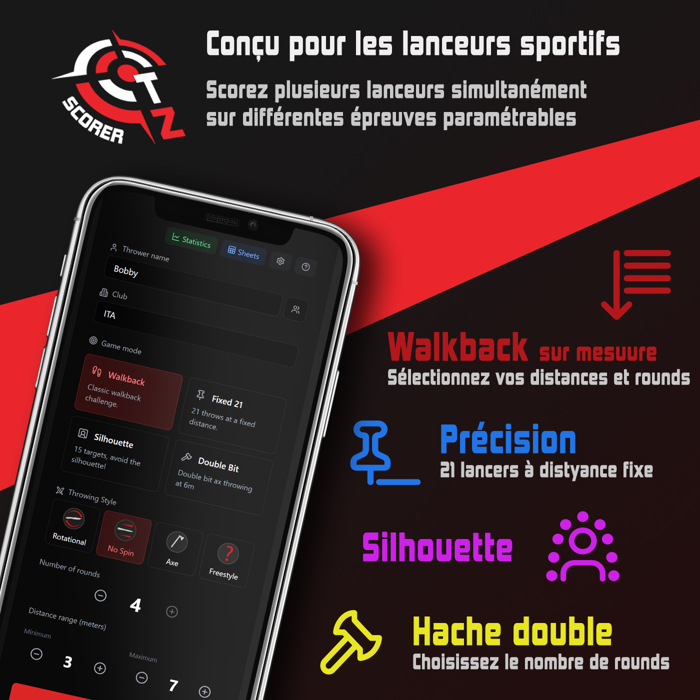 TZ Scorer vous accompagne à chaque session, que ce soit pour un simple entraînement, une compétition amicale ou un tournoi officiel. Grâce à son interface pensée pour les lanceurs, vous pouvez :